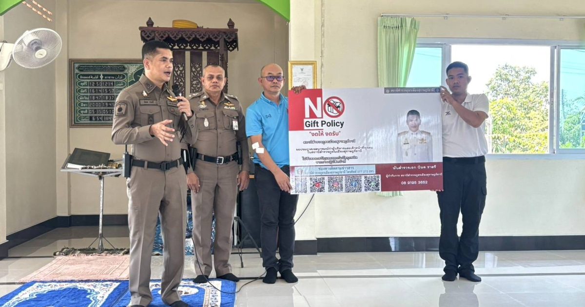 เมื่อวันที่ 26 มี.ค.67 เวลา 14.00 น. พ.ต.อ.นิพล ชาตรี ผกก.สภ.เมืองสุราษฎร์ธานี ได้ประชาสัมพันธ์ประกาศเจตนารมณ์ ไม่รับของขวัญและของกำนัลทุกชนิด จากการปฏิบัติหน้าที่ (No Gift Policy) ให้ประชาชุมชนหลังคลัง