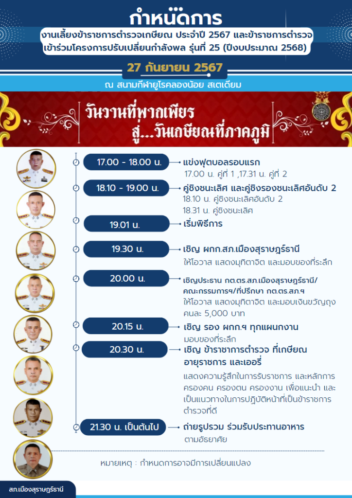 กำหนดจัดงานเลี้ยงข้าราชการตำรวจเกษียณ ประจำปี ๒๕๖๗ และข้าราชการตำรวจเข้าร่วมโครงการปรับเปลี่ยนกำลังพล รุ่นที่ ๒๕ (ปีงบประมาณ พ.ศ.๒๕๖๘) (เออลี่) ในวันศุกร์ที่ ๒๗ ก.ย.๖๗ เวลา ๑๗.๐๐ – ๒๓.๐๐ น. ณ สนามยูโรคลองน้อยสเตเดี้ยม โดยมีการจัดงานเลี้ยง และมีการแข่งกันกีฬาฟุตบอลเพื่อเชื่อมความสัมพันธ์ภายในหน่วยงาน และพบปะสังสรรค์ เพื่อให้การจัดกิจกรรมดังกล่าวเป็นไปด้วยความเรียบร้อย ขอเชิญข้าราชการตำรวจในปกครองทุกนาย และครอบครัว เข้าร่วมกิจกรรมดังกล่าว