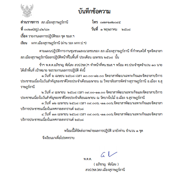สภ.เมืองสุราษฎร์ธานี วันนี้ ( 26 เม.ย.2568 ) เวลา 08.10 น. ภายใต้การอำนวยการของ พ.ต.อ.พรณรงค์ ก